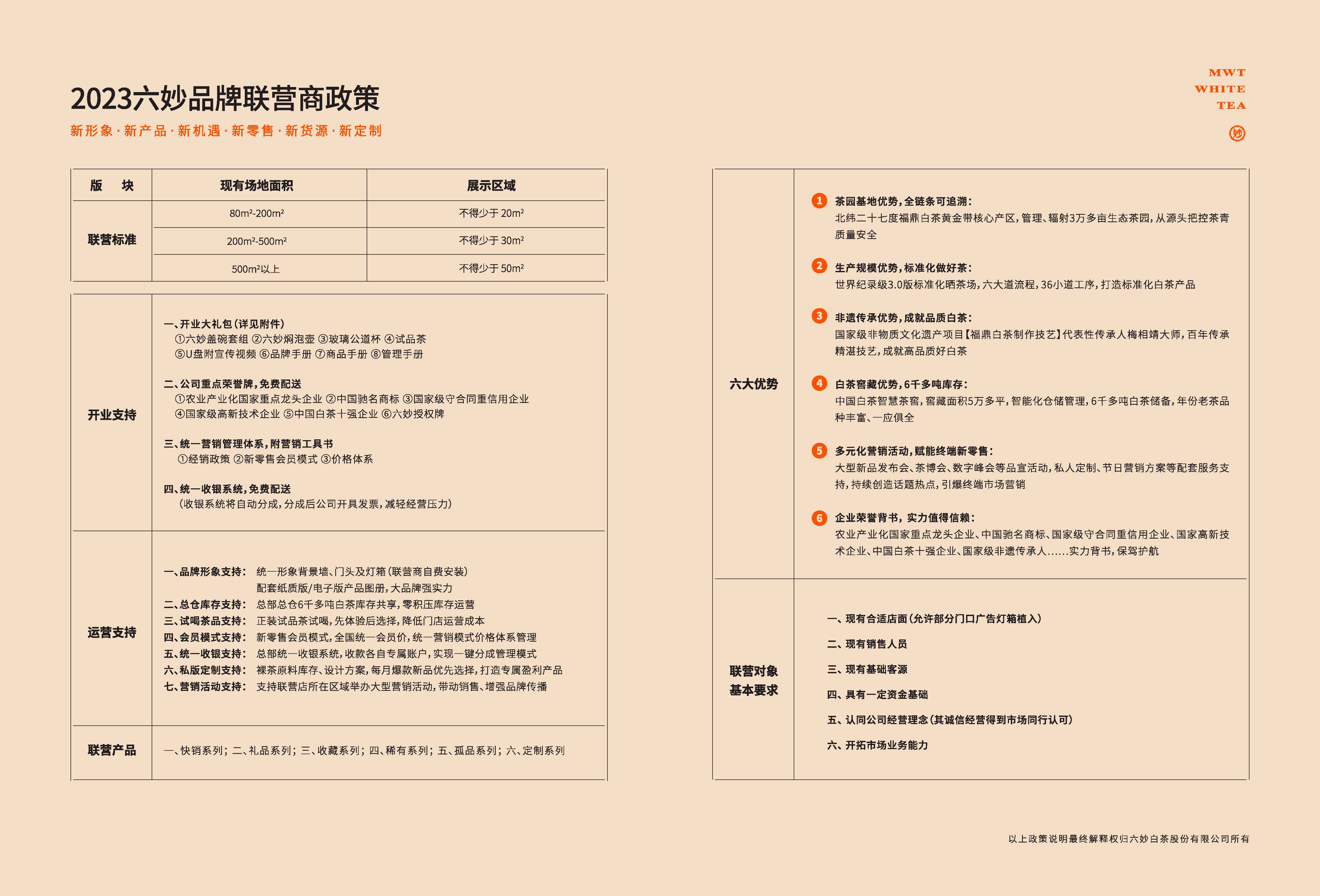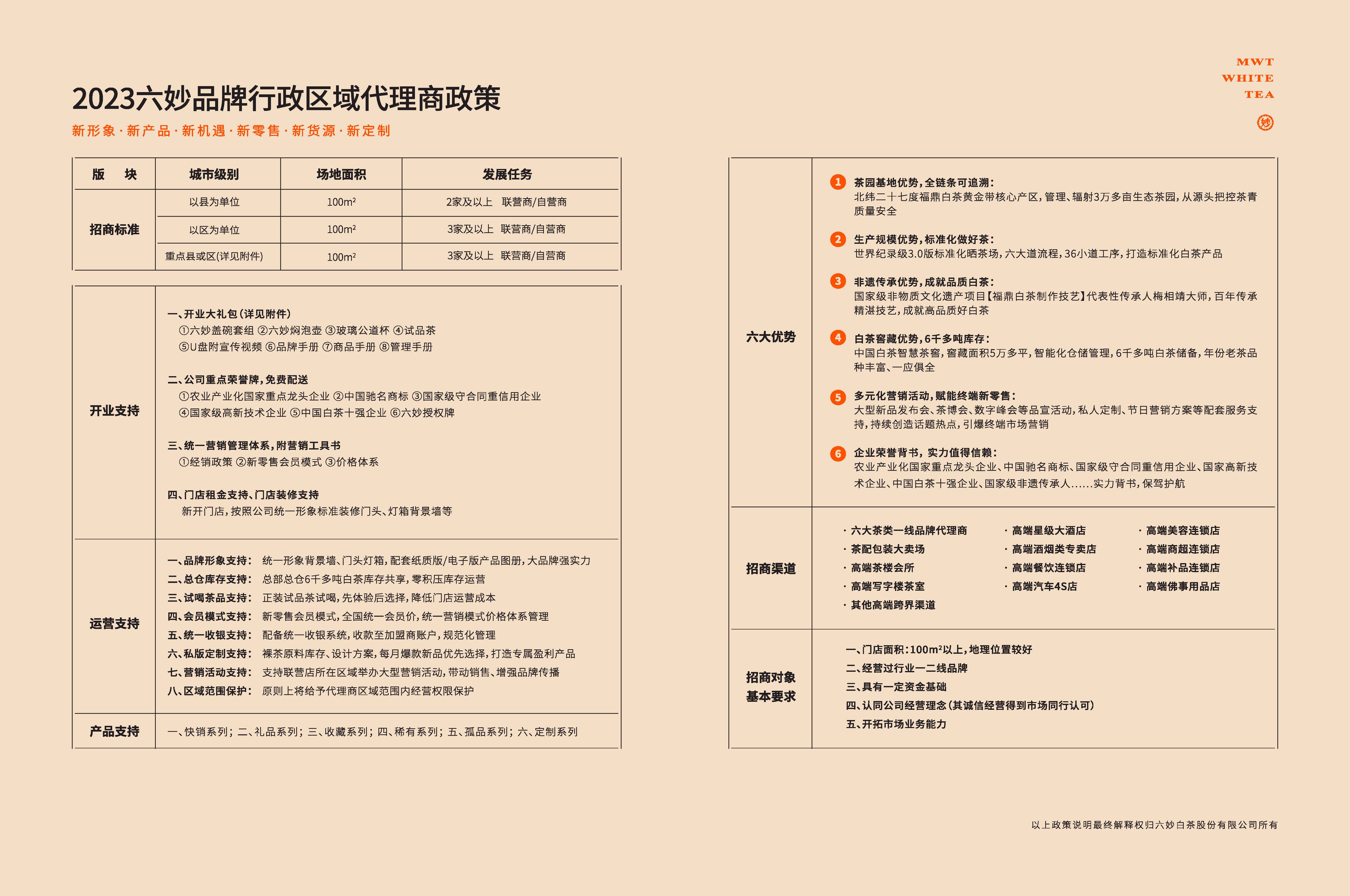 六妙白茶傾情推出三大招商合作政策,現以“新形象·新產品·新機遇·新零售·新貨源·新定制”六新模式展開對全國招募特約合作商,共同打造以消費者體驗為核心的新篇章。